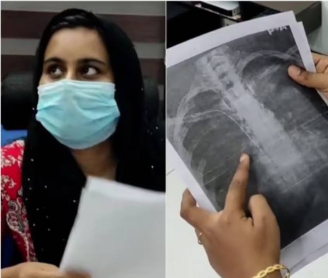 ശസ്ത്രക്രിയയ്ക്കുശേഷം ഞരമ്പ് കിട്ടാതെ വന്നപ്പോൾ രക്തവും മരുന്നുകളും നൽകാനായി സെൻട്രൽ ലൈനിട്ടു. ഇതിന്റെ ഗൈഡ് വയറാണ് നെഞ്ചിൽ കുടുങ്ങി കിടക്കുന്നത്. ശസ്ത്രക്രിയയ്ക്ക് ശേഷം ഇത് തിരികെ എടുക്കാത്തതാണ് ദുരിതത്തിലാക്കിയത് എന്നാണ് പരാതി. തുടർന്ന് ശ്രീ ചിത്ര ആശുപത്രിയിലടക്കം സുമയ്യ ചികിത്സ തേടി. എക്സ്റേ പരിശോധനയിൽ ട്യൂബ് ധമനികളോട് ഒട്ടിപ്പോയതായി കണ്ടെത്തി. ഇനി ശസ്ത്രക്രിയ നടത്തി ട്യൂബ് പുറത്തെടുക്കാനാകില്ലെന്നാണ് വിദഗ്ധ ഡോക്ടർമാർ അറിയിച്ചത്. ഗുരുതര പിഴവ് ഉണ്ടായതിൽ നീതിവേണമെന്നും വിദഗ്ധ ചികിത്സ നൽകണമെന്നുമാണ് സുമയ്യ ആവശ്യപ്പെടുന്നത്.