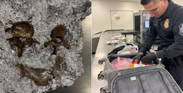 ഉദ്യോഗസ്ഥരുടെ പരിശോധനയിൽ ഫോയിൽ പൊതിഞ്ഞ ഡഫൽ ബാഗിൽ ഒരു മനുഷ്യന്റെ തലയോട്ടിയും അസ്ഥികളും കണ്ടെത്തി. അവശിഷ്ടങ്ങൾ ആചാരപരമായ ഉപയോഗത്തിനുള്ളതാണെന്ന് യാത്രക്കാരൻ പറഞ്ഞു.