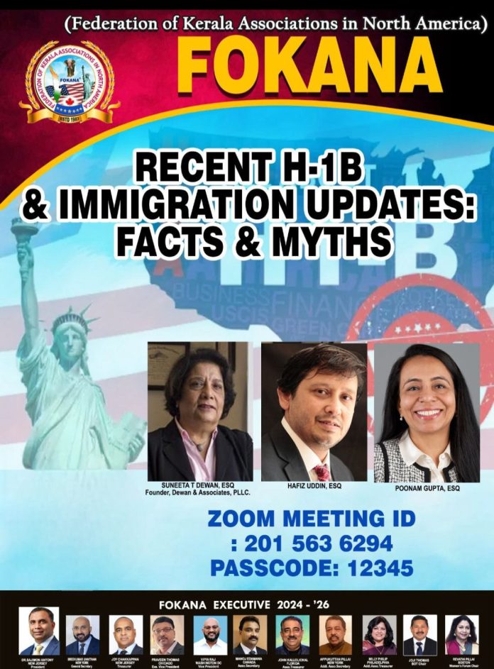 ന്യുയോർക്ക്: എച്ച് 1 ബി വിസയെക്കുറിച്ചും കുടിയേറ്റ നിയമങ്ങളിലെ മാറ്റങ്ങളെക്കുറിച്ചും അതിന്റെ യാഥാർഥ്യങ്ങളും മിഥ്യാധാരണകളും ചർച്ച ചെയ്യുന്നതിന് ഫൊക്കാന സംഘടിപ്പിച്ച വെബിനാർ ശ്രദ്ധേയമായി. നിലവിൽ അമേരിക്കയിൽ എച്ച് 1 ബി വിസയിലും സ്റ്റുഡന്റ് വിസയിലും വിസിറ്റിംഗ് വിസയിലും കഴിയുന്ന ഇന്ത്യക്കാർക്കും വിസ പ്രോസസിംഗ് നടക്കുന്നവർക്കും ഗ്രീൻ കാർഡ് ഉടമകൾക്കും പുതിയ പ്രഖ്യാപനത്തോടെ ഉയർന്ന ആശങ്കകൾക്കും സംശയങ്ങൾക്കും പരിഹാരം ഒരുക്കാനാണ് വെബ്ബിനാർ സംഘടിപ്പിച്ചതെന്ന് ഫൊക്കാന പ്രസിഡന്റ് സജിമോൻ ആന്റണി, ജനറൽ സെക്രട്ടറി ശ്രീകുമാർ ഉണ്ണിത്താൻ, ട്രഷറർ ജോയ് ചാക്കപ്പൻ എന്നിവർ അറിയിച്ചു.