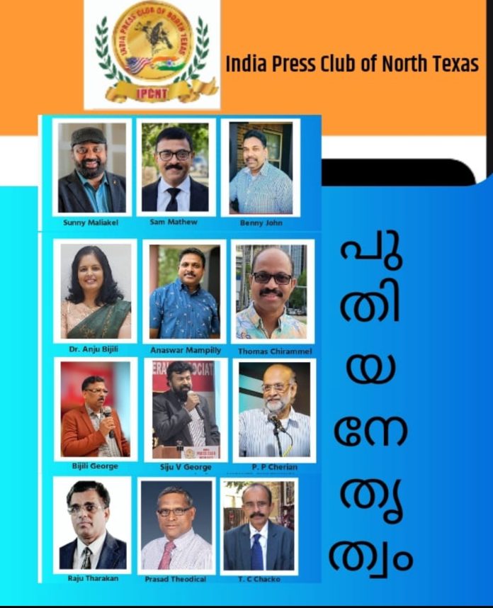 ഇന്ത്യാ പ്രസ് ക്ലബ് ഓഫ് നോർത്ത് ടെക്സസ് (IPCNT) അടുത്ത രണ്ടു വർഷത്തെ ഭാരവാഹികളായി പ്രസിഡൻറ് സണ്ണി മാളിയേക്കൽ, വൈസ് പ്രസിഡണ്ട് ഡോ.അഞ്ചു ബിജിലി, സെക്രട്ടറി സാം മാത്യു, ജോയിൻ്റ് സെക്രട്ടറി, അനശ്വർ മാമ്പിള്ളി, ട്രഷറർ ബെന്നി ജോൺ, ജോ.ട്രഷറർ തോമസ് ചിറമേൽ.എന്നിവരെ തിരഞ്ഞെടുത്തു.