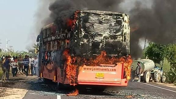 ജയ്സല്മേര് : രാജസ്ഥാനില് സ്വകാര്യ ബസിനു തീപിടിച്ച് വന് ദുരന്തം. 20 യാത്രക്കാര്ക്ക് ദാരുണാന്ത്യം. 16 പേര്ക്കു ഗുരുതരമായി പൊള്ളലേറ്റിട്ടുമുണ്ട്. ജോധ്പുര്-ജയ്സല്മേര് ഹൈവേയില് ഇന്നലെ വൈകിട്ട് മൂന്നോടെയായിരുന്നു അപകടം. ബസിനു പിന്ഭാഗത്തുനിന്ന് പുക ഉയര്ന്നതുകണ്ടാണ് ഡ്രൈവര് ബസ് നിര്ത്തിയത്. എന്നാല്, നിമിഷങ്ങള്ക്കുള്ളില് തീ ആളിപ്പടരുകയായിരുന്നു. 57 യാത്രക്കാരാണുണ്ടായിരുന്നത്. 19 പേര് ബസിനുള്ളില്വച്ചുതന്നെ മരിച്ചു. ഷോര്ട് സര്ക്യൂട്ടാണ് അപകടകാരണമെന്നാണു പ്രാഥമിക നിഗമനം.