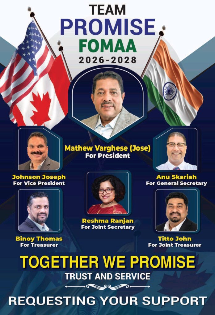 ഇതാദ്യമായി യുവതലമുറക്ക് വലിയ പ്രാധാന്യം നൽകി ഫോമായിൽ മാറ്റത്തിന്റെ കാഹളമായി ‘ടീം പ്രോമിസ്.’ അവിഭക്ത ഫൊക്കാനയിലും ഫോമയിലും മറ്റു സംഘടനകളിലും ദേശീയ നേതൃത്വത്തിൽ വിജയകരമായി പ്രവർത്തിച്ചിട്ടുള്ള മാത്യു വർഗീസ് (ജോസ്-ഫ്ലോറിഡ) നേതൃത്വം നൽകുന്ന ടീം പ്രോമിസ് പാനലിൽ ജനറൽ സെക്രട്ടറിയായി ഫിലാഡൽഫിയയിൽ നിന്ന് അനു സ്ക്കറിയയും ട്രഷററായി ന്യു യോർക്കിൽ നിന്ന് ബിനോയി തോമസും വൈസ് പ്രസിഡന്ടായി കാലിഫോർണിയയിൽ നിന്ന് ജോൺസൺ ജോസഫും ജോ. സെക്രട്ടറി ആയി ഡാലസിൽ നിന്ന് രേഷ്മാ രഞ്ജനും ജോ. ട്രഷററായി ഫ്ലോറിഡയിൽ നിന്ന് ടിറ്റോ ജോണും മത്സരിക്കുന്നു.
