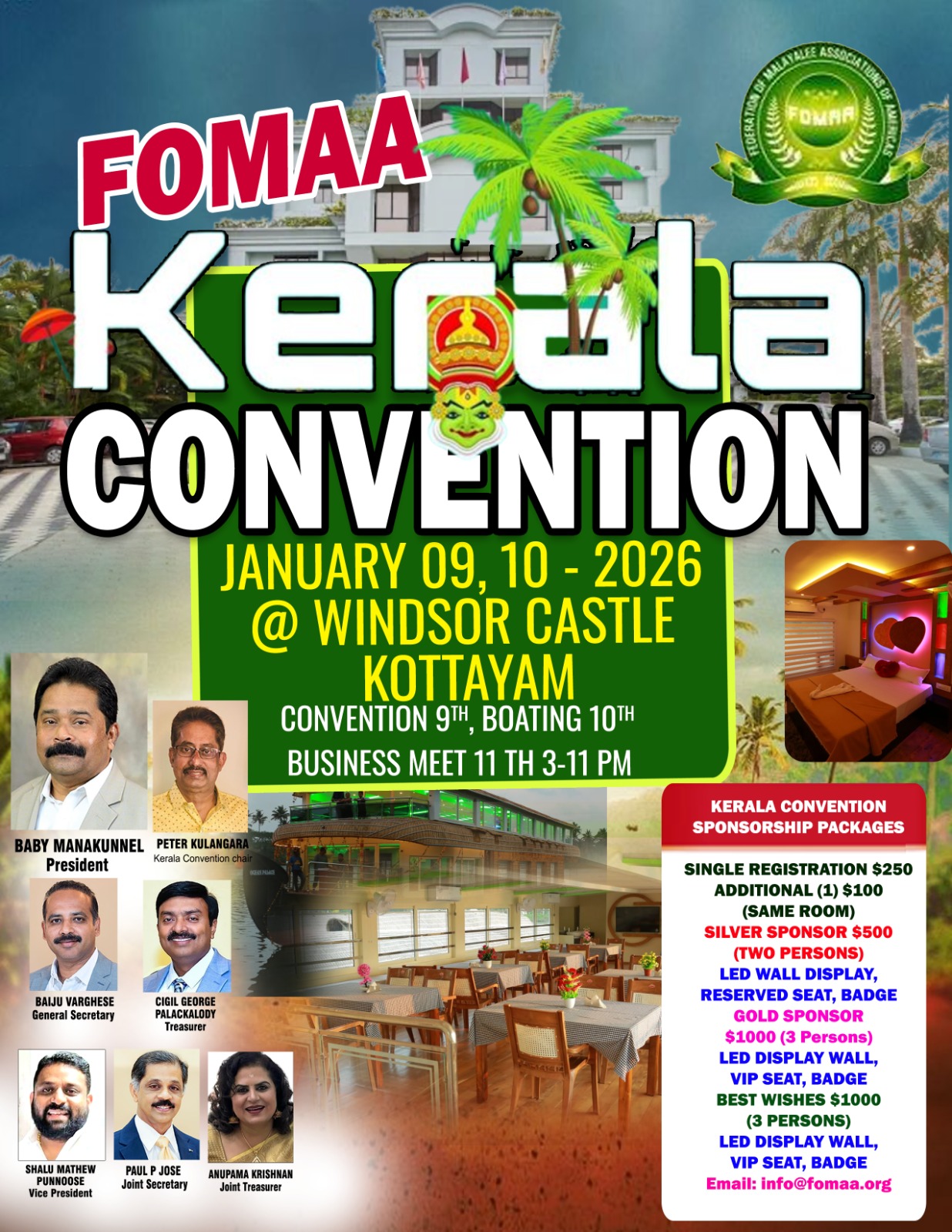 കോട്ടയം: കേരള ഫെഡറേഷൻ ഓഫ് മലയാളി അസോസിയേഷൻസ് ഓഫ് അമേരിക്കാസ് കേരള കൺവെൻഷൻ 2026 ജനുവരി 9, 10 തീയതികളിൽ കോട്ടയത്ത് നടക്കും.