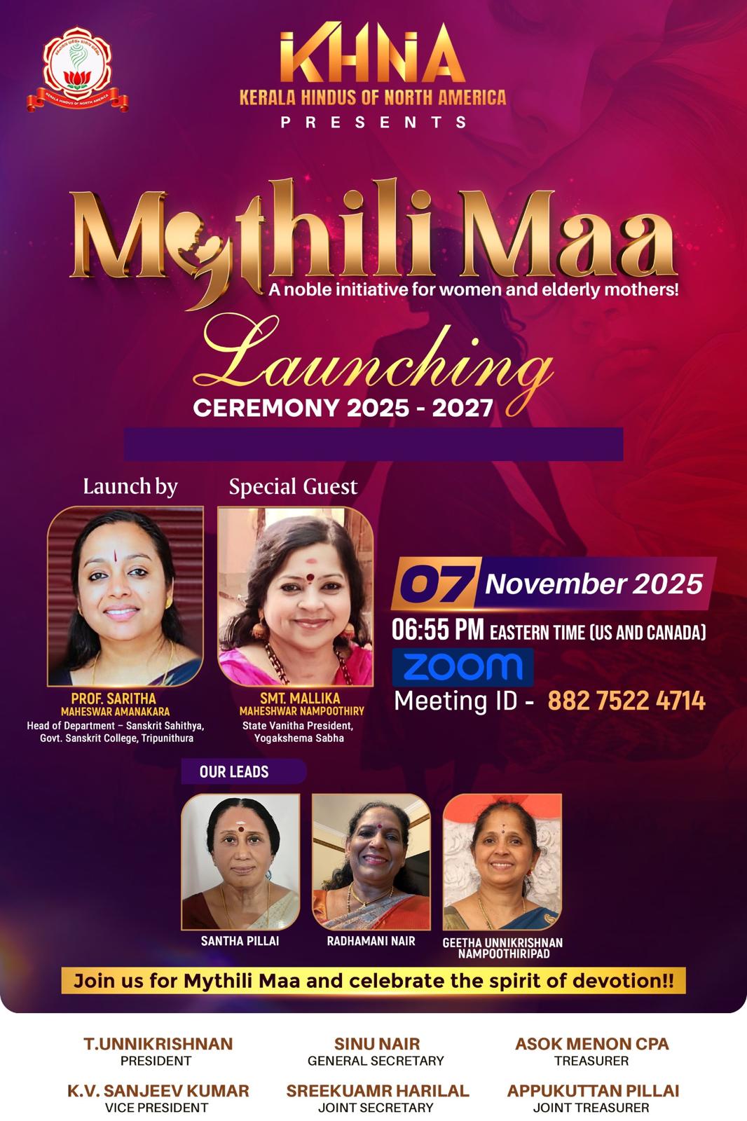 ഫ്ലോറിഡ: കേരള ഹിന്ദൂസ് ഓഫ് നോർത്ത് അമേരിക്ക (കെ.എച്ച്.എൻ.എ) സംഘടിപ്പിക്കുന്ന “മൈഥിലി മാ” ലളിതാസഹസ്രനാമാർച്ച സംഘടിപ്പിക്കുന്നു. നവംബർ 7 വെള്ളിയാഴ്ചയാണ് നാമാർച്ചനയുടെ പുതിയ തുടക്കം.