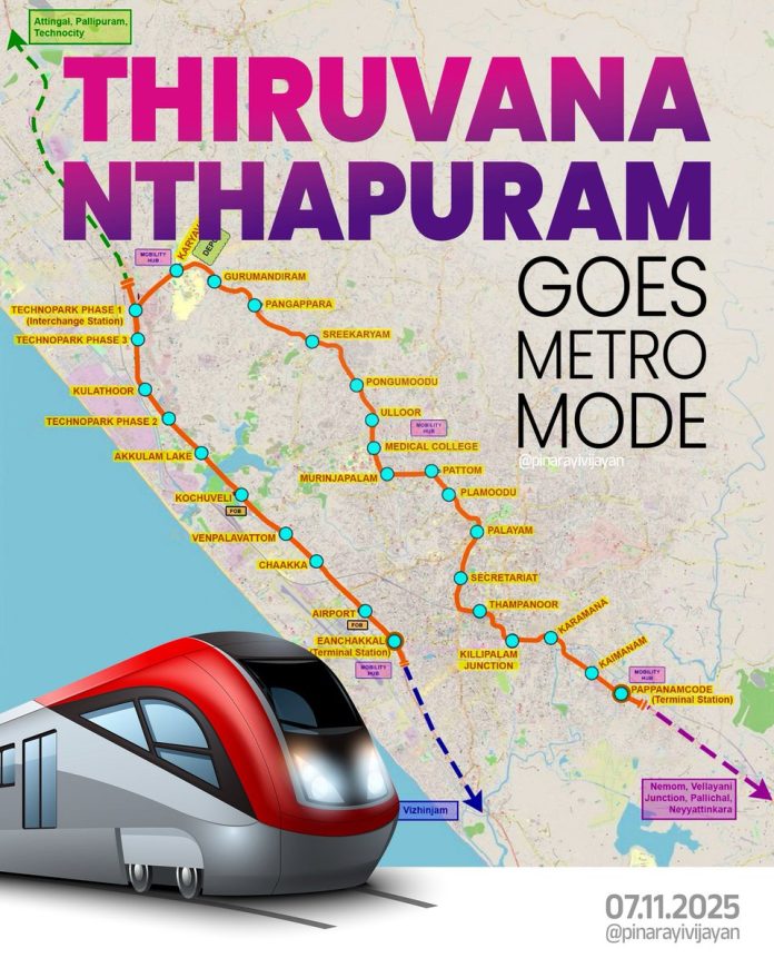 തിരുവനന്തപുരം: തലസ്ഥാനത്ത് മെട്രോ റെയില് പദ്ധതിയുടെ ആദ്യ ഘട്ട അലൈന്മെൻ്റിന് മുഖ്യമന്ത്രി പിണറായി വിജയന് അംഗീകാരം നൽകി. ടെക്നോപാര്ക്കിന്റെ മൂന്ന് ഫേസുകള്, വിമാനത്താവളം, തമ്പാനൂര് ബസ് സ്റ്റാൻഡ്, റെയില്വേ സ്റ്റേഷന്, സെക്രട്ടറിയേറ്റ്, മെഡിക്കല് കോളേജ്, എന്നിവ ബന്ധിപ്പിക്കുന്ന ആദ്യ ഘട്ട അലൈന്മെന്റാണ് അംഗീകരിച്ചത്. കൊച്ചി മെട്രോ റെയില് ലിമിറ്റഡ് (KMRL) മുഖേനയാണ് പദ്ധതി നടപ്പിലാക്കുക.