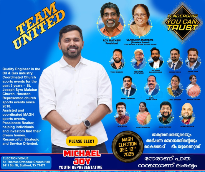 ഹൂസ്റ്റൺ: ഗ്രേറ്റർ ഹൂസ്റ്റൺ മലയാളി അസോസിയേഷന്റെ (MAGH) 2026-ലേക്കുള്ള ഭരണസമിതി തിരഞ്ഞെടുപ്പിൽ, റോയ് മാത്യു നയിക്കുന്ന ‘ടീം യുണൈറ്റഡ്’ (Team United) പാനലിൽ നിന്ന് യുവജന പ്രതിനിധിയായി (Youth Representative) മൈക്കിൾ ജോയ് ജനവിധി തേടുന്നു.
