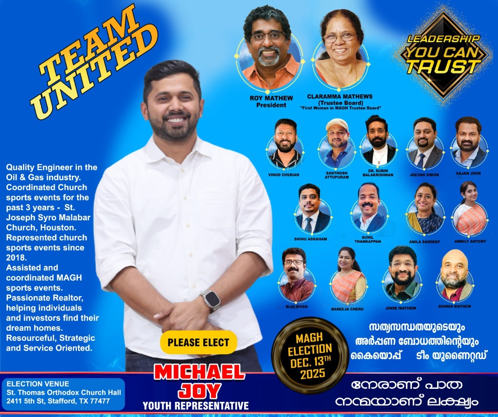 തിരഞ്ഞെടുപ്പ് വിവരങ്ങൾ: റോയ് മാത്യു (പ്രസിഡന്റ്), ക്ലാരമ്മ മാത്യൂസ് (ട്രസ്റ്റി ബോർഡ്) എന്നിവർ നേതൃത്വം നൽകുന്ന പാനലിൽ വിനോദ് ചെറിയാൻ, സന്തോഷ് ആറ്റുപുറം, ഡോ. സുബിൻ ബാലകൃഷ്ണൻ, ജീവൻ സൈമൺ, സാജൻ ജോൺ, ഷിനു എബ്രഹാം, സുനിൽ തങ്കപ്പൻ, അനില സന്ദീപ്, അമ്പിളി ആന്റണി, ബിജു ശിവൻ, ബനീജ ചെറു, ജിൻസ് മാത്യു, ഡെന്നിസ് മാത്യു തുടങ്ങിയ പ്രഗത്ഭർ അണിനിരക്കുന്നു. . 2025 ഡിസംബർ 13-ന് ശനിയാഴ്ച സ്റ്റാഫോർഡ് സെന്റ് തോമസ് ഓർത്തഡോക്സ് ചർച്ച് ഹാളിൽ (2411 5th St, Stafford, TX 77477) വെച്ചാണ് തിരഞ്ഞെടുപ്പ് നടക്കുന്നത്.