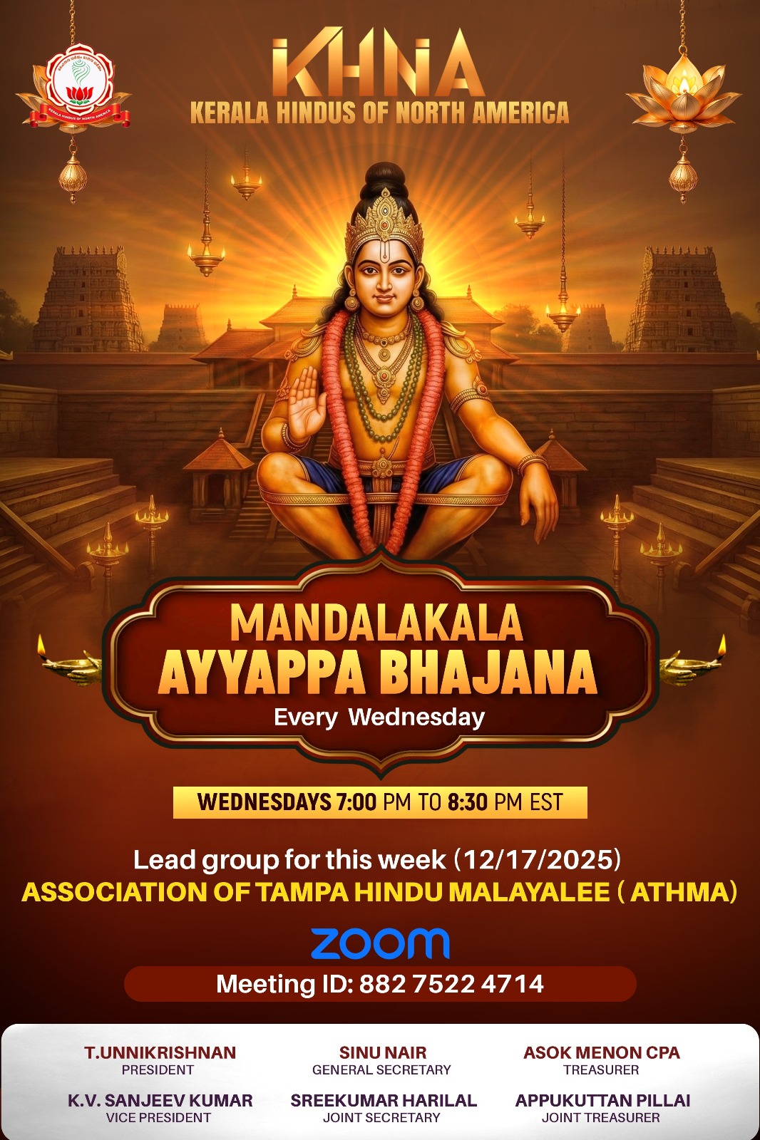 ടാംപ (ഫ്ലോറിഡ): മണ്ഡല-മകരവിളക്ക് തീർത്ഥാടന കാലത്തോടനുബന്ധിച്ച് വടക്കേ അമേരിക്കയിലെ അയ്യപ്പ ഭക്തർക്കായി കേരള ഹിന്ദുസ് ഓഫ് നോർത്ത് അമേരിക്ക (KHNA) എല്ലാ ബുധനാഴ്ചയും ഓൺലൈൻ ‘മണ്ഡലകാല അയ്യപ്പ ഭജന’ നടത്തുന്നു.