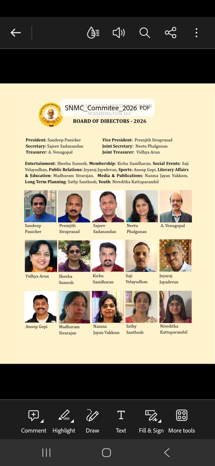 അമേരിക്കയുടെ തലസ്ഥാനമായ വാഷിംഗ്ടൻ ഡിസി ആസ്ഥാനമായി കഴിഞ്ഞ ഇരുപത്തിയഞ്ചു വർഷത്തിൽ ഏറെയായി പ്രവർത്തിക്കുന്ന പ്രമുഖ ശ്രീനാരായണ സംഘടനയായ ശ്രീനാരായണ മിഷൻ സെന്ററിന്റെ 2026 വർഷത്തിലേക്കുള്ള ഭാരവാഹികളെ തിരഞ്ഞെടുത്തു. ഡിസംബർ ഏഴാം തീയതി വാഷിംഗ്ടൻ ഡിസിക്ക് സമീപമുള്ള എൽക്റിഡ്ജ് പബ്ലിക് ലൈബ്രറിയിൽ വച്ച് നടന്ന വാർഷിക പൊതുയോഗത്തിൽ വച്ചാണ് പുതിയ ഭാരവാഹികളെ എതിരില്ലാതെ തിരഞ്ഞെടുത്തത്.