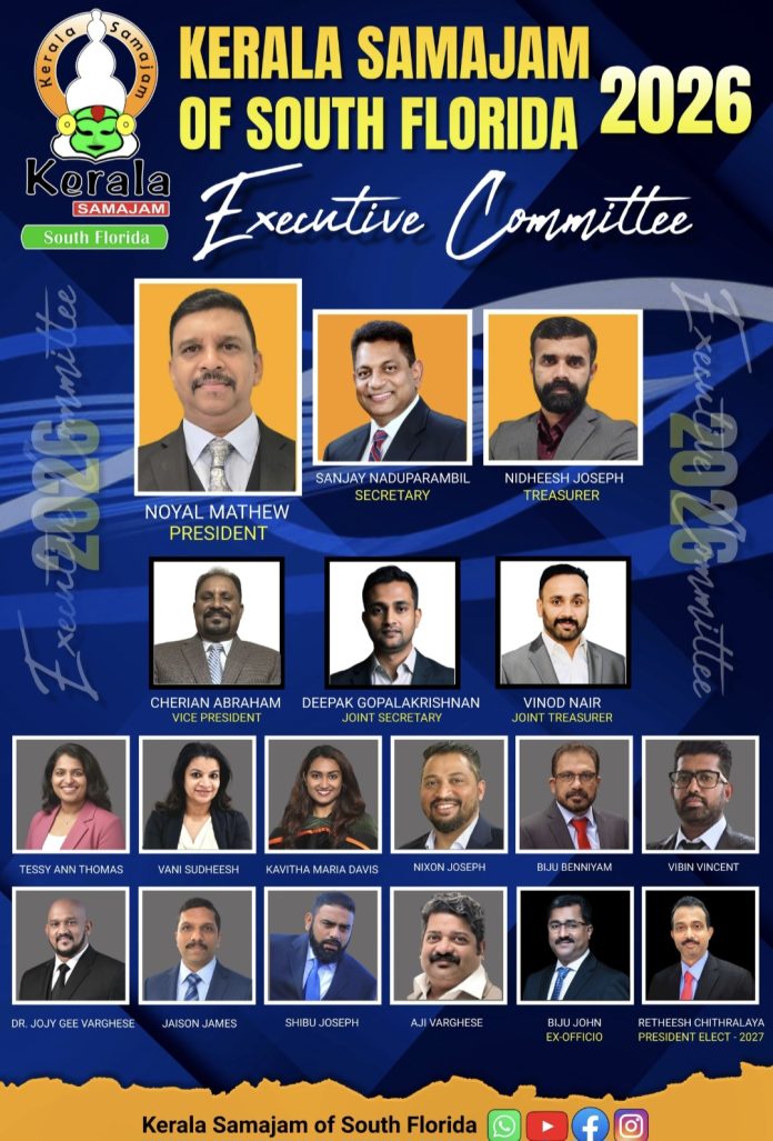 സൗത്ത് ഫ്ലോറിഡ: കേരളസമാജം ഓഫ് സൗത്ത് ഫ്ലോറിഡയുടെ 43-)0 പ്രസിഡന്റ് ആയി ശ്രീ:നോയൽ മാത്യുവിന്റെ നേതൃത്വത്തിൽ 18 അംഗ ഭരണസമിതി 2026 ജനുവരി ഒന്നിന് നിലവിൽ വന്നു. ഡിസംബർ 13, 2025 നു ചേർന്ന കേരളസമാജം സൗത്ത് ഫ്ലോറിഡയുടെ പൊതുയോഗമാണ് പുതിയ ഭരണസമിതിക്ക് അംഗീകാരം നൽകിയത്.