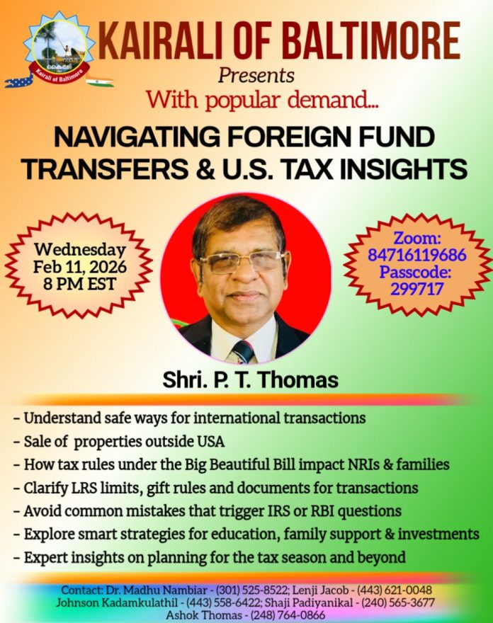 ബാൾട്ടിമോർ, മേരിലാൻഡ്: കൈരളി ഓഫ് ബാൾട്ടിമോർ (KoB) ലോകമെമ്പാടുമുള്ള പ്രവാസി ഇന്ത്യക്കാർക്കായി “Navigating Foreign Fund Transfers & U.S. Tax Insights” എന്ന വിഷയത്തിൽ സെഷൻ സംഘടിപ്പിക്കുന്നു. ഫെബ്രുവരി 11, ബുധനാഴ്ച രാത്രി 8 മണിക്ക് (EST) Zoom വഴിയാണ് സെഷൻ നടക്കുന്നത്.