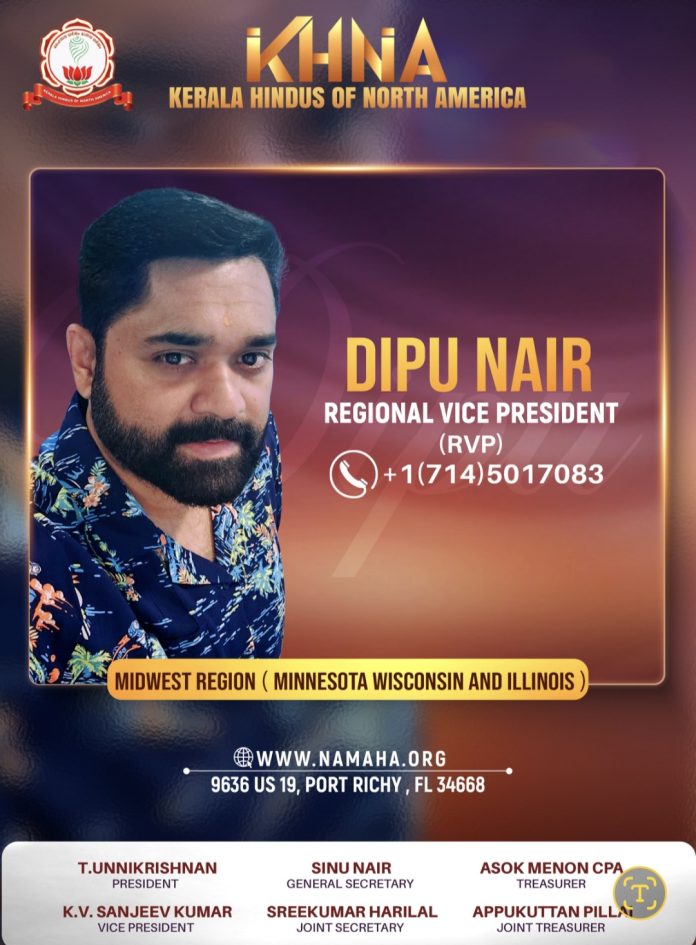 ചിക്കാഗോ : നോർത്ത് അമേരിക്കയിലെ മലയാളി ഹിന്ദുക്കളുടെ ദേശീയ സംഘടനയായ Kerala Hindus of North America (KHNA)യുടെ മിഡ്വെസ്റ്റ് റീജിയണൽ വൈസ് പ്രസിഡന്റായി (RVP) ദീപു നായരെ നിയമിച്ചു. മിന്നസോട്ട, വിസ്കോൺസിൻ, ഇലിനോയി എന്നിവ ഉൾപ്പെടുന്ന മിഡ്വെസ്റ്റ് മേഖലയിൽ KHNAയുടെ പ്രവർത്തനങ്ങൾക്ക് പുതുജീവൻ നൽകുകയും യുവതലമുറയെ കൂടുതൽ സജീവമായി സംഘടനയിലേക്ക് ആകർഷിക്കുകയും ചെയ്യുന്നതാണ് അദ്ദേഹത്തിന്റെ പ്രധാന ദൗത്യം.