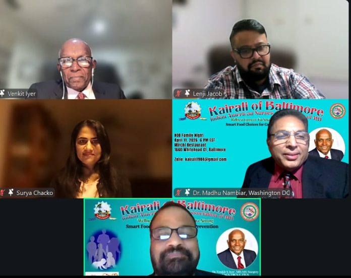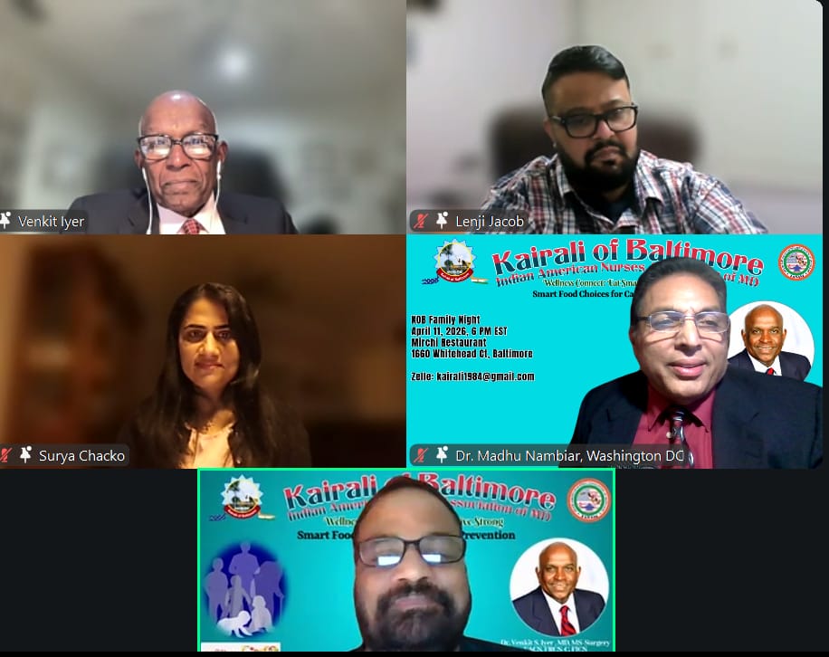 ബാൾട്ടിമോർ, MD : നാഷണൽ ന്യൂട്രിഷൻ മന്തിന്റെ ഭാഗമായി, കെയ്റളി ഓഫ് ബാൾട്ടിമോർയും ഇന്ത്യൻ അമേരിക്കൻ നഴ്സസ് അസോസിയേഷൻ ഓഫ് മേരിലാൻഡ് (IANAM) ഉം ചേർന്ന് സംഘടിപ്പിച്ച “വെൽനസ് കണക്റ്റ്: ഈറ്റ് സ്മാർട്ട്, ലൈവ് സ്ട്രോങ്ങ് – സ്മാർട്ട് ഫുഡ് ചോയ്സസ് ഫോർ കാൻസർ പ്രിവൻഷൻ” എന്ന ഓൺലൈൻ വെൽനസ് സെഷൻ ശ്രദ്ധേയമായി. കുടുംബങ്ങൾ, ആരോഗ്യപ്രവർത്തകർ, യുവാക്കളും മുതിർന്നവരും ഉൾപ്പെടെ സമൂഹത്തിലെ വിവിധ വിഭാഗങ്ങളിൽ നിന്നുള്ളവർ സജീവമായി പങ്കെടുത്ത ഈ പരിപാടി, ഭക്ഷണശീലങ്ങളും ജീവിതശൈലിയും കാൻസർ പ്രതിരോധത്തിൽ വഹിക്കുന്ന നിർണായക പങ്കിനെക്കുറിച്ച് ആഴത്തിലുള്ള ബോധവൽക്കരണം സൃഷ്ടിച്ചു.