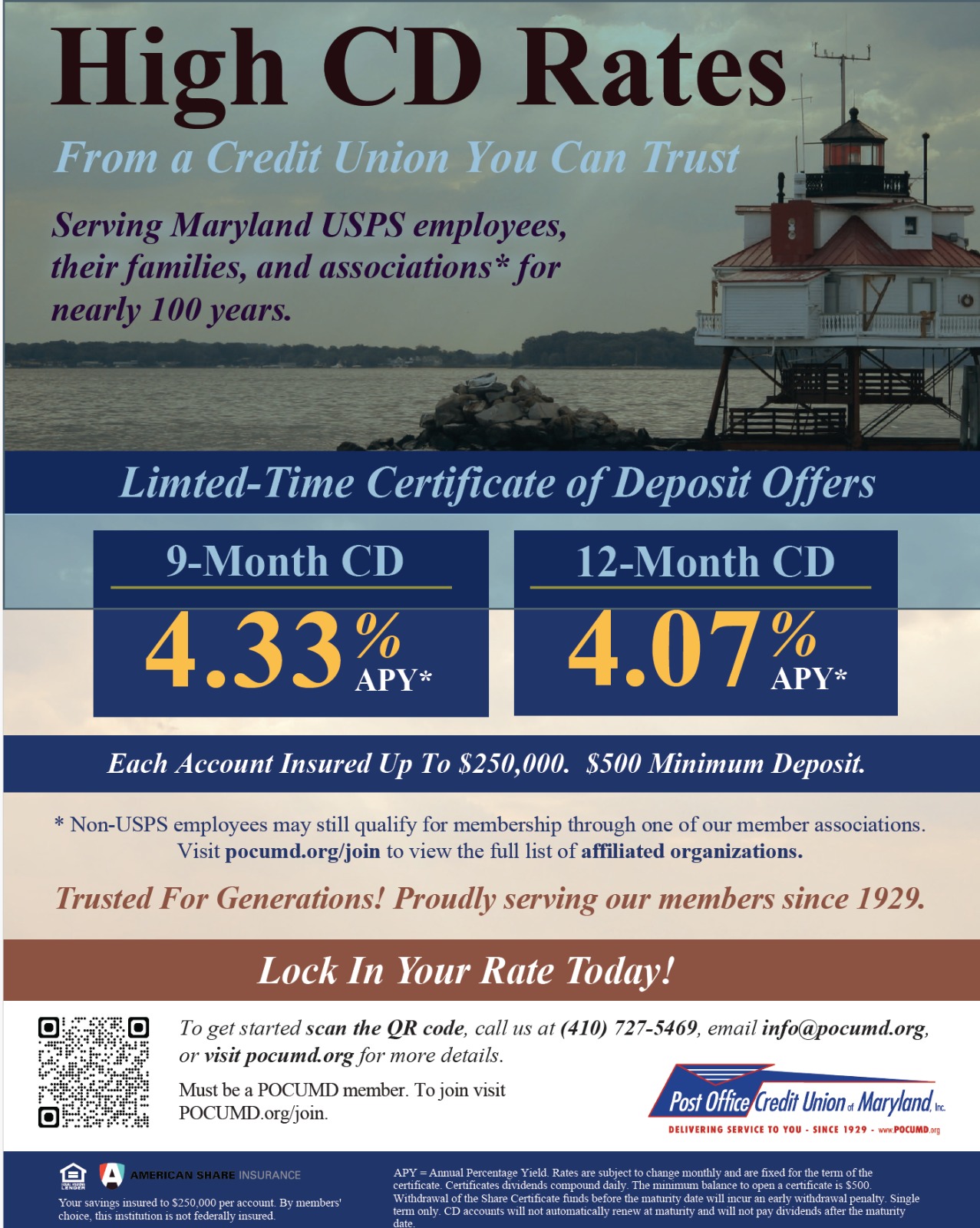 POCUMD-യുടെ നിലവിലെ ഓഫറുകൾ പ്രകാരം, അംഗങ്ങൾക്ക് പരിമിതകാല സർട്ടിഫിക്കറ്റ് ഓഫ് ഡെപ്പോസിറ്റ് (CD) പദ്ധതികളിൽ ആകർഷകമായ നിരക്കുകൾ ലഭ്യമാണ്—9 മാസ CD-യ്ക്ക് 4.33% APYയും 12 മാസ CD-യ്ക്ക് 4.07% APYയും. ഓരോ അക്കൗണ്ടും $250,000 വരെ ഇൻഷ്വർഡ് ആണെന്നും, കുറഞ്ഞത് $500 നിക്ഷേപം മതി എന്നും POCUMD ഡോക്യുമെന്റിൽ വ്യക്തമാക്കുന്നു.