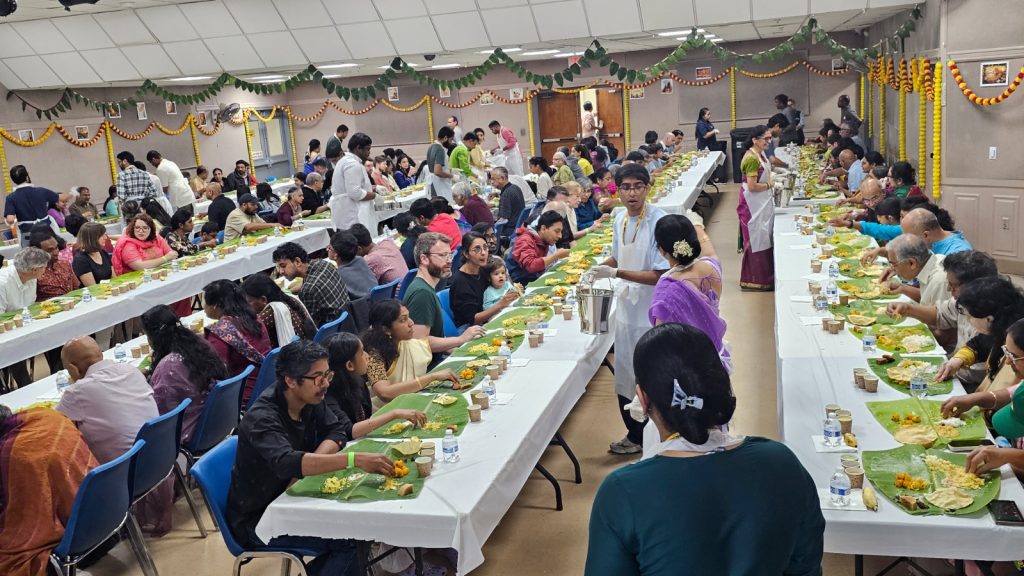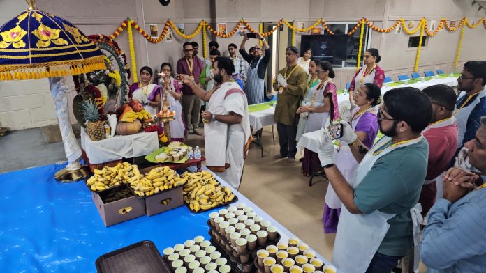 ആഘോഷങ്ങൾക്ക് കൂടുതൽ തിളക്കം പകർന്നത് ഏപ്രിൽ 19‑നു ഒരുക്കിയ വാഴയില സദ്യയായിരുന്നു. കേരളത്തിന്റെ പാരമ്പര്യ രുചികളെ പൂർണ്ണമായി പുനരാവിഷ്കരിച്ച ഈ സദ്യയിൽ വെജിറ്റബിൾ റൈസ്, സാംബാർ, വത്തക്കുഴമ്പ്, ചൗ‑ചൗ കൂട്ടു, വിവിധ പൊരിയലുകൾ, ബീറ്റ്റൂട്ട് വട, പരിപ്പ് പായസം, മോർ, അപ്പളം തുടങ്ങി സമൃദ്ധമായ വിഭവങ്ങൾ ഉൾപ്പെടുത്തി. വാഴയിലയിൽ ഇരുന്ന് കുടുംബങ്ങളോടൊപ്പം സദ്യ ആസ്വദിച്ച ഭക്തരുടെ മുഖത്ത് കണ്ട സന്തോഷം, കേരളത്തിലെ വീട്ടുവിശേഷങ്ങളുടെ ഓർമ്മകളെ പുതുക്കി.